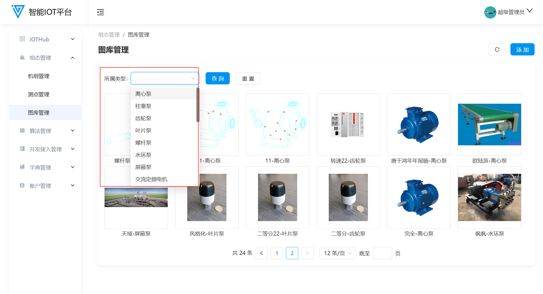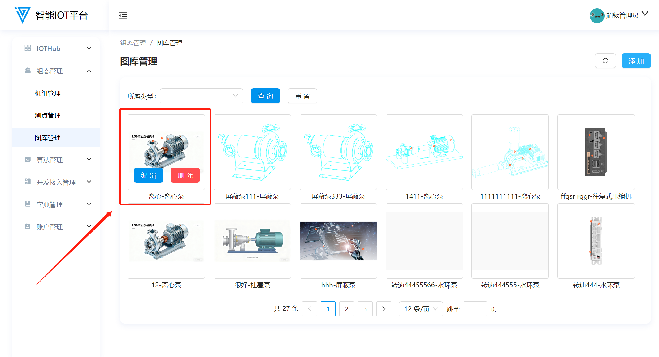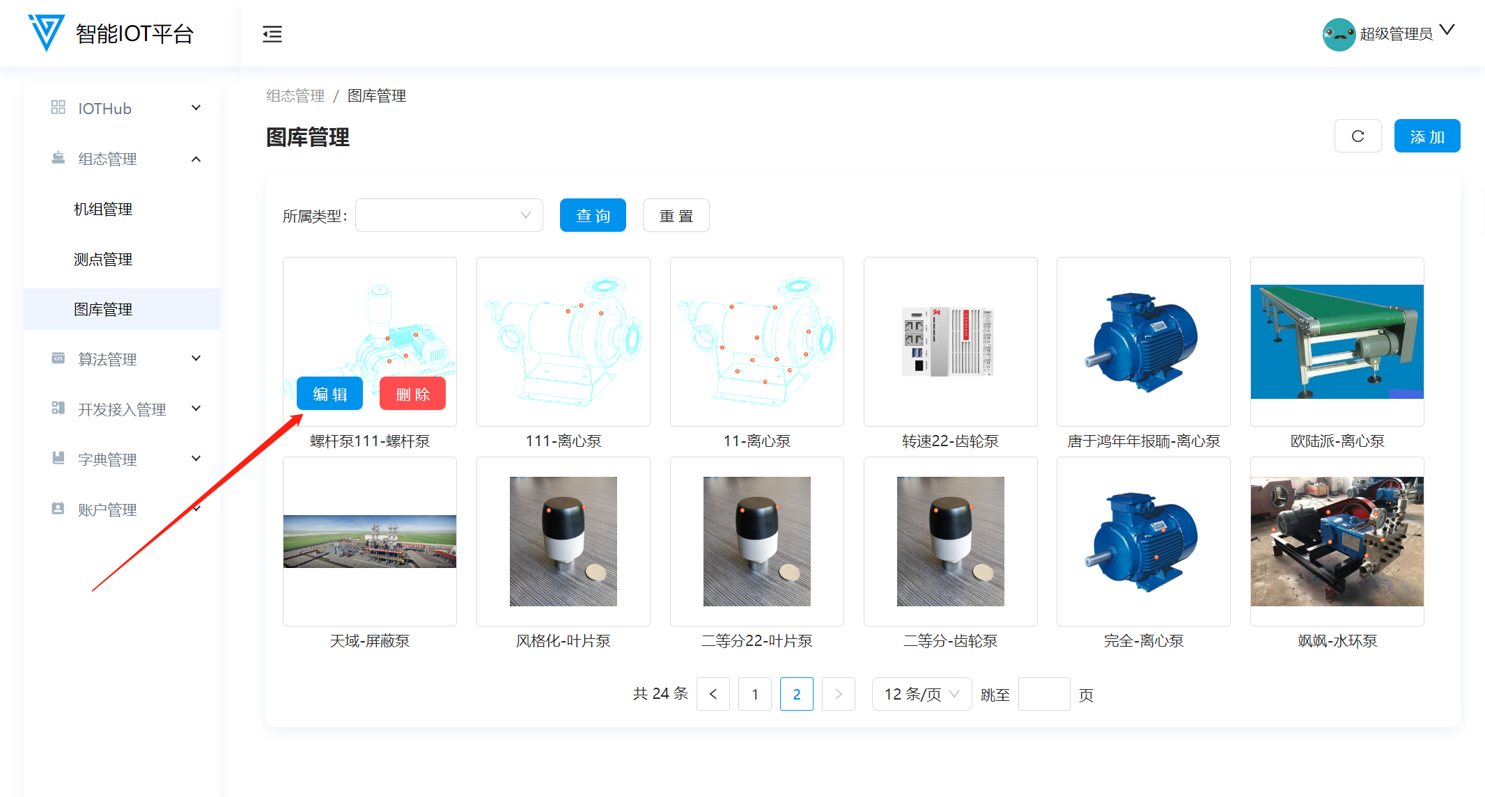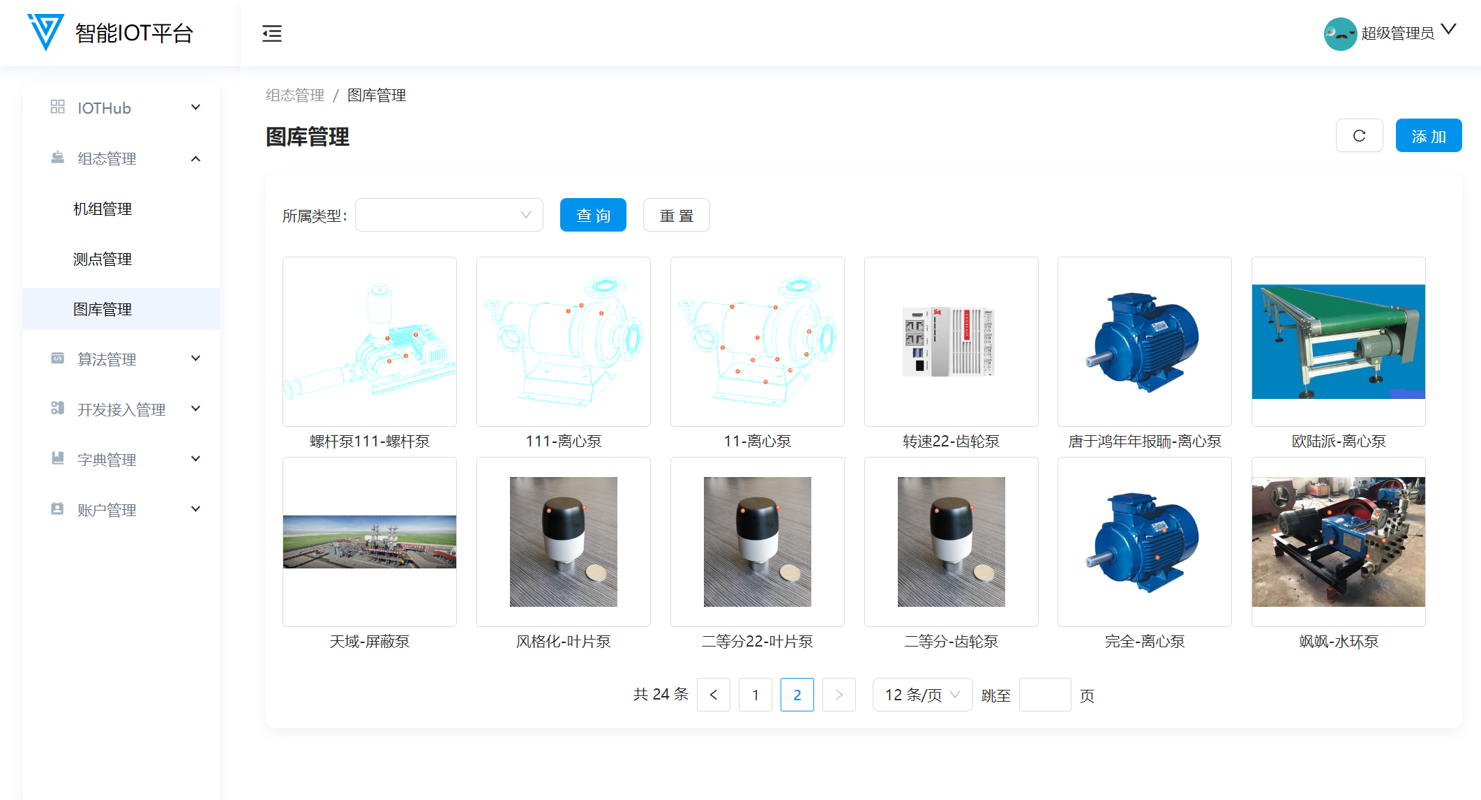 图库管理列表,列表为图片卡片形式,按照创建时间倒序排列,可以对卡片进行添加、编辑、查询、删除操作