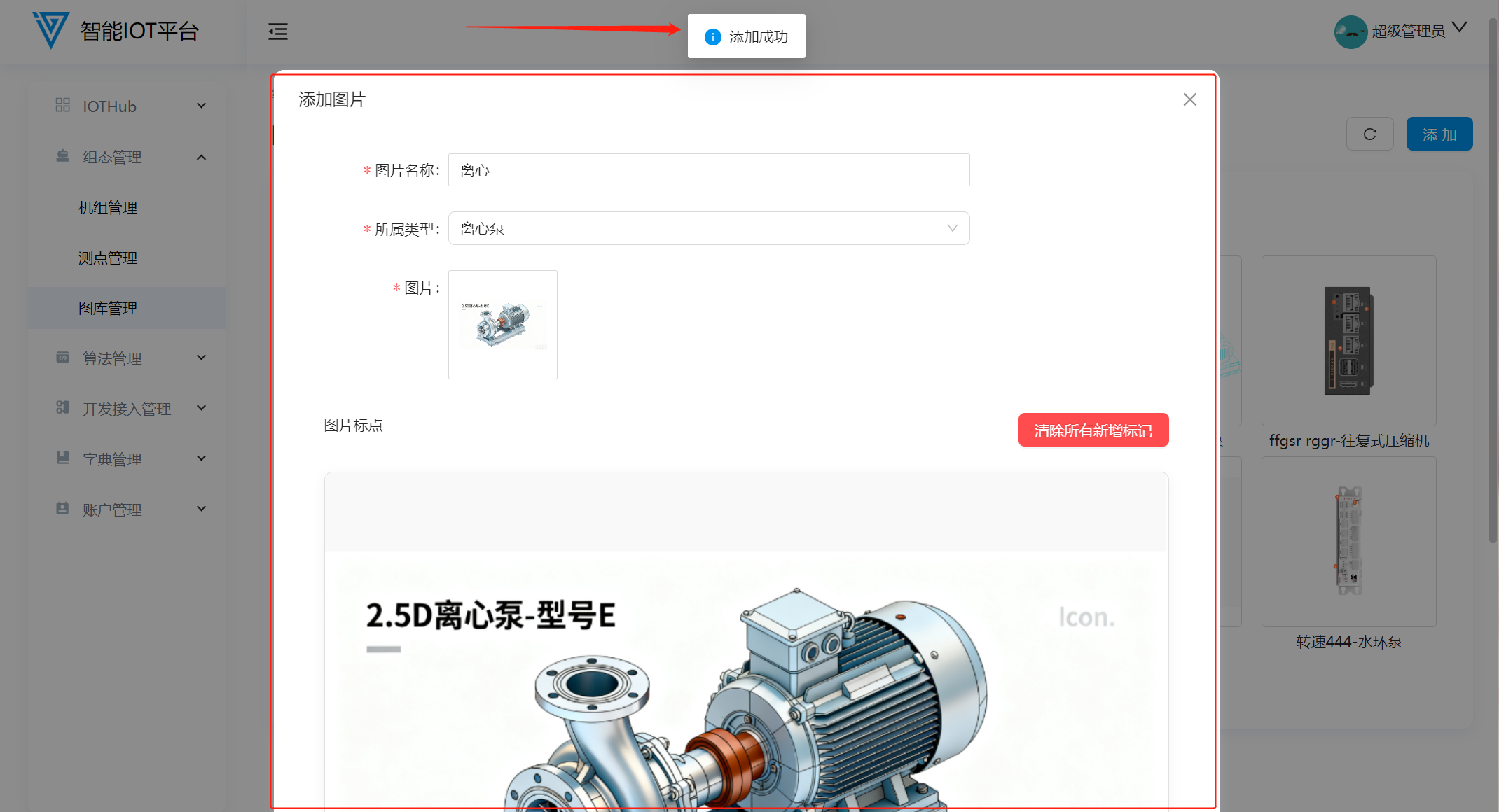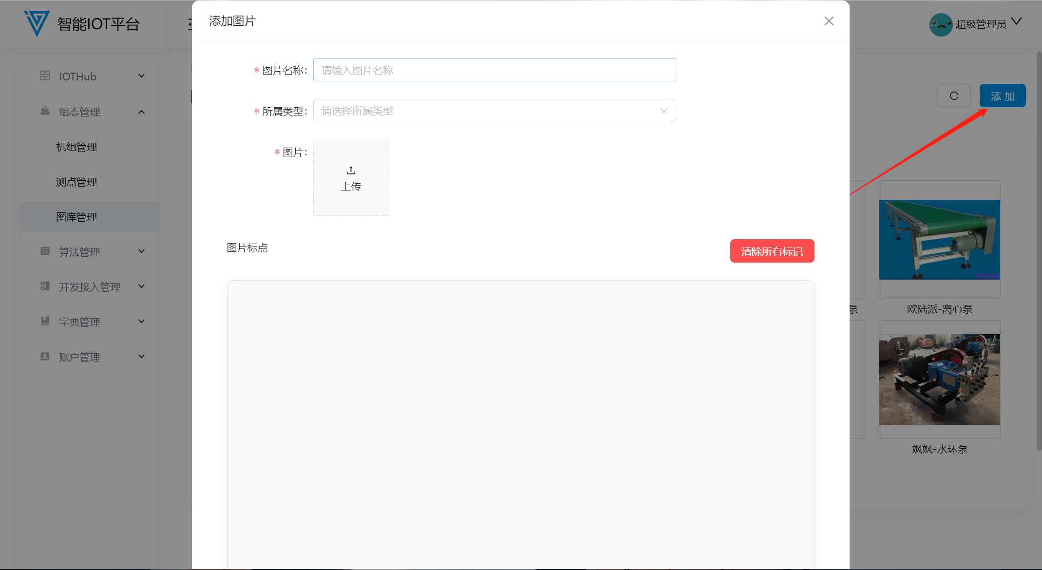 点击添加按钮,弹出添加图片弹框,在弹窗内填写信息进行添加,图片名称、所属类型图片为必填