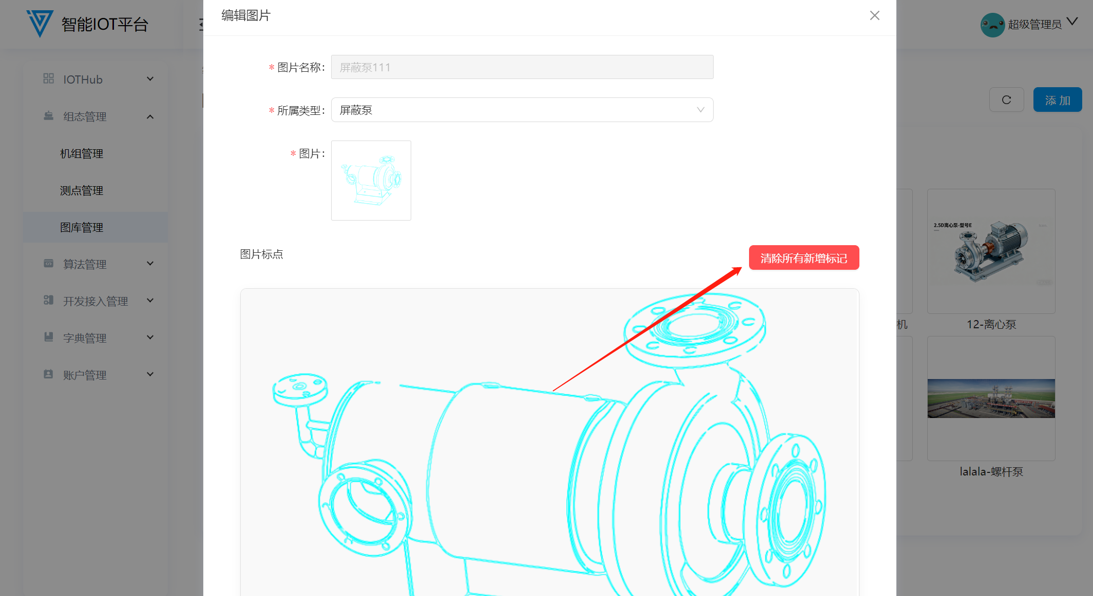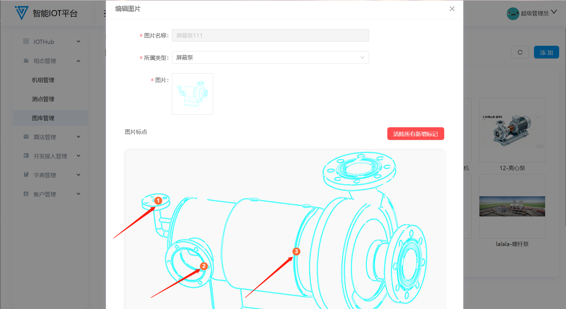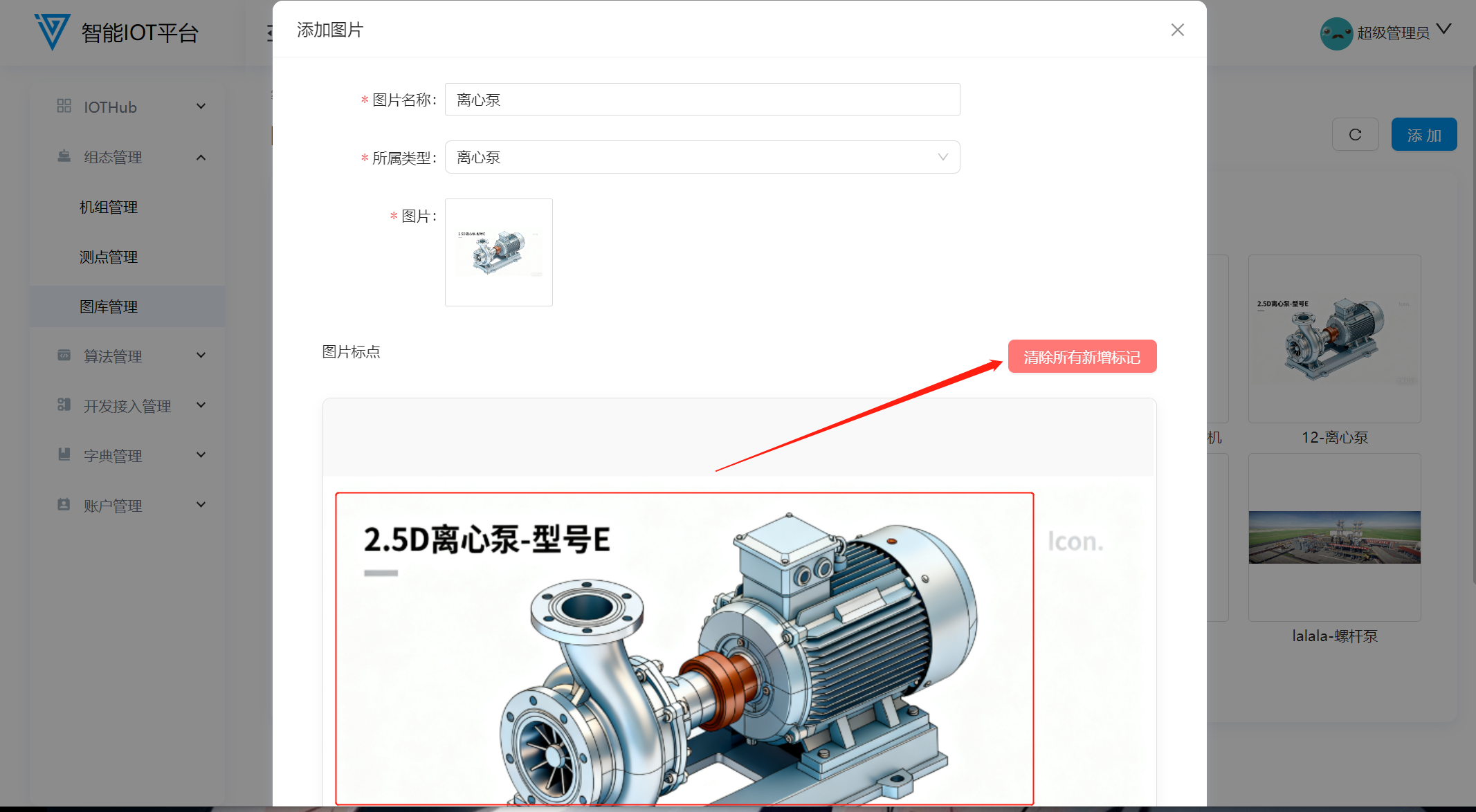 进行图片标点编辑时,鼠标点击图片相关位置即可进行标点,标点的数字依次递增;删除标点时,点击右上方的“清除所有标记”按钮,即可清除图片上刚刚标记的所有点位