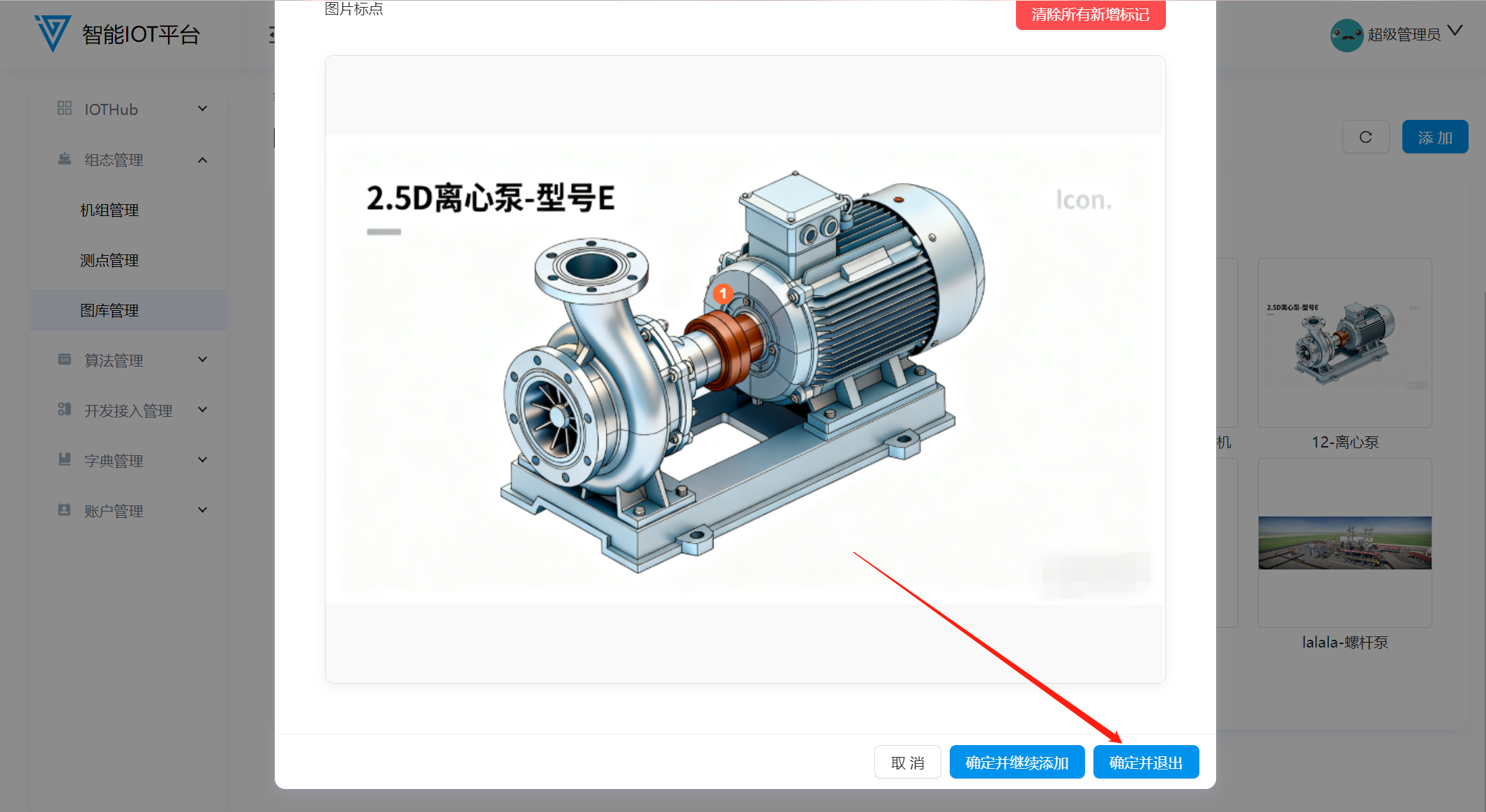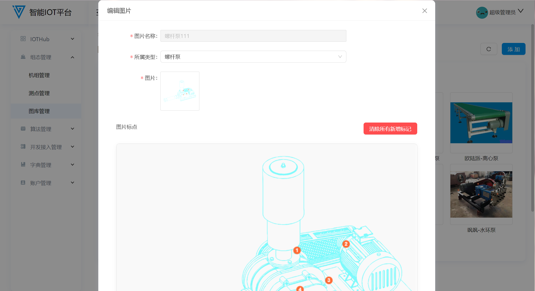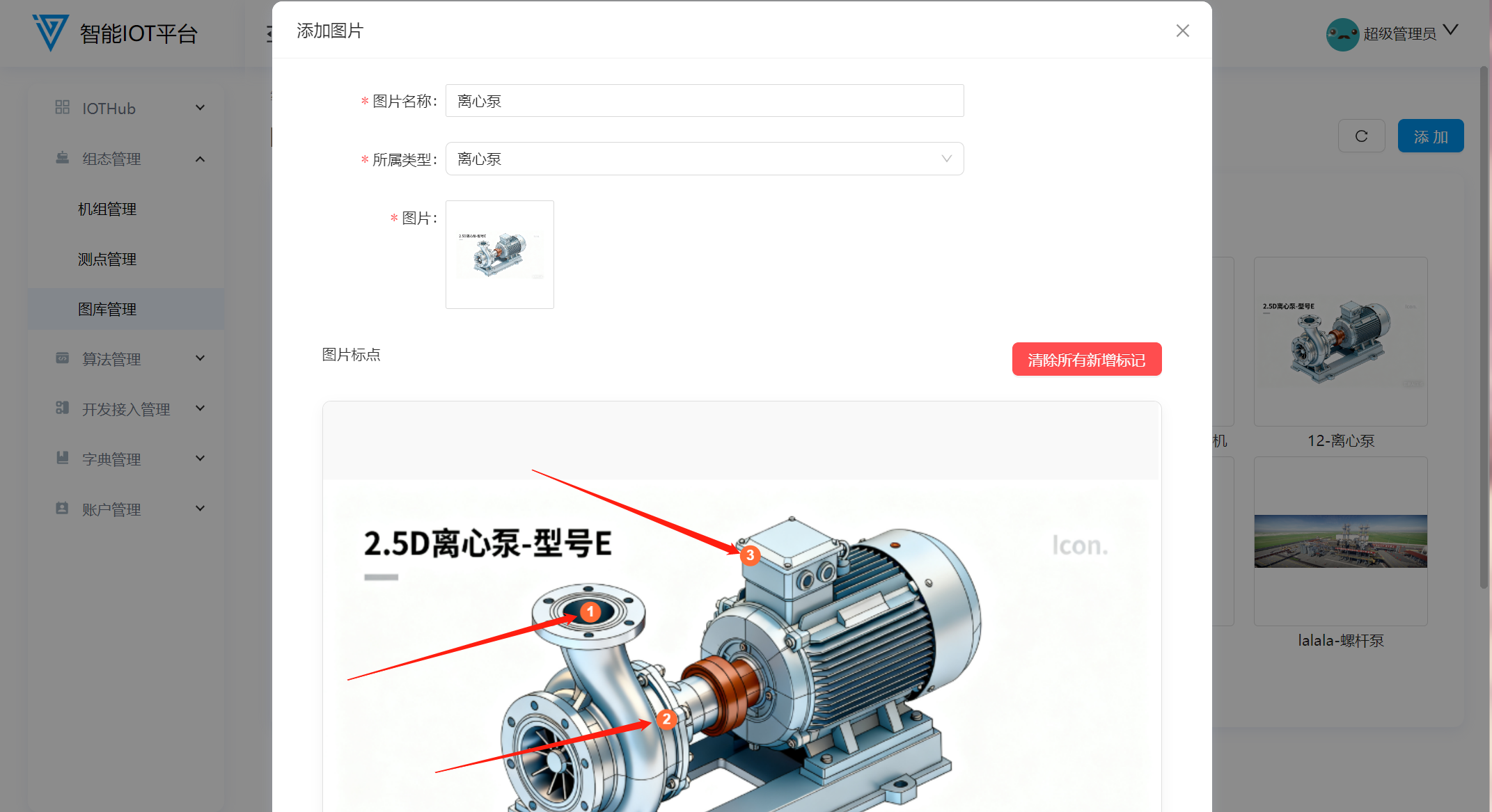进行图片标点编辑时,鼠标点击图片相关位置即可进行标点,标点的数字依次递增;删除标点时,点击右上方的“清除所有标记”按钮,即可清除图片上刚刚标记的所有点位