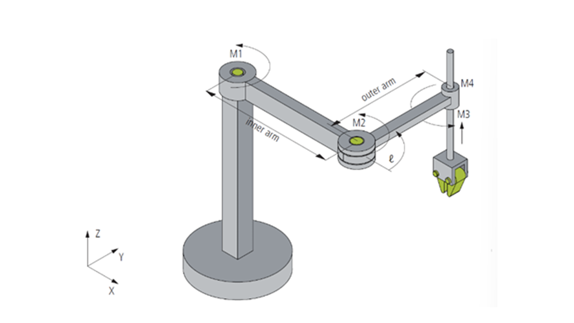 4D-SCARA(选择性顺应装配机器人臂)是一种具有四自由度(DOF)的机器人,其运动学结构和电机轴配置如图所示。电机轴M1、M2和M4为旋转轴,单位为角度(°),箭头指示其正向旋转方向。第三个电机轴M3为线性轴,单位为毫米(mm),用于实现垂直方向的运动。