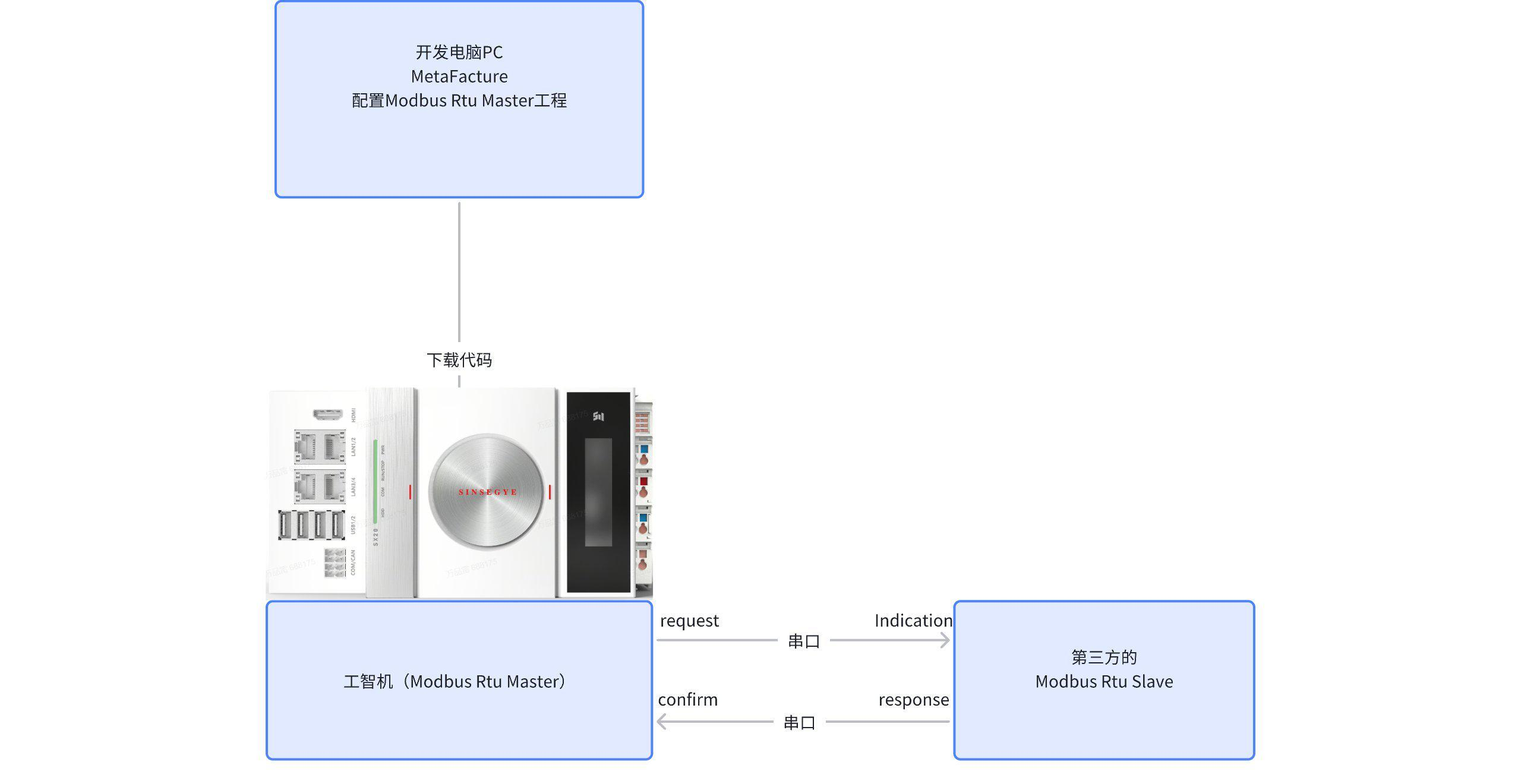 Metafacture Modbus Ascii站通过串口连接向第三方Modbus Ascii从站发送请求,主要包含:功能码、目标寄存器的地址和数量、写操作时的数据;从站收到请求后先检查数据的合法性,然后执行请求的操作,响应主站请求;