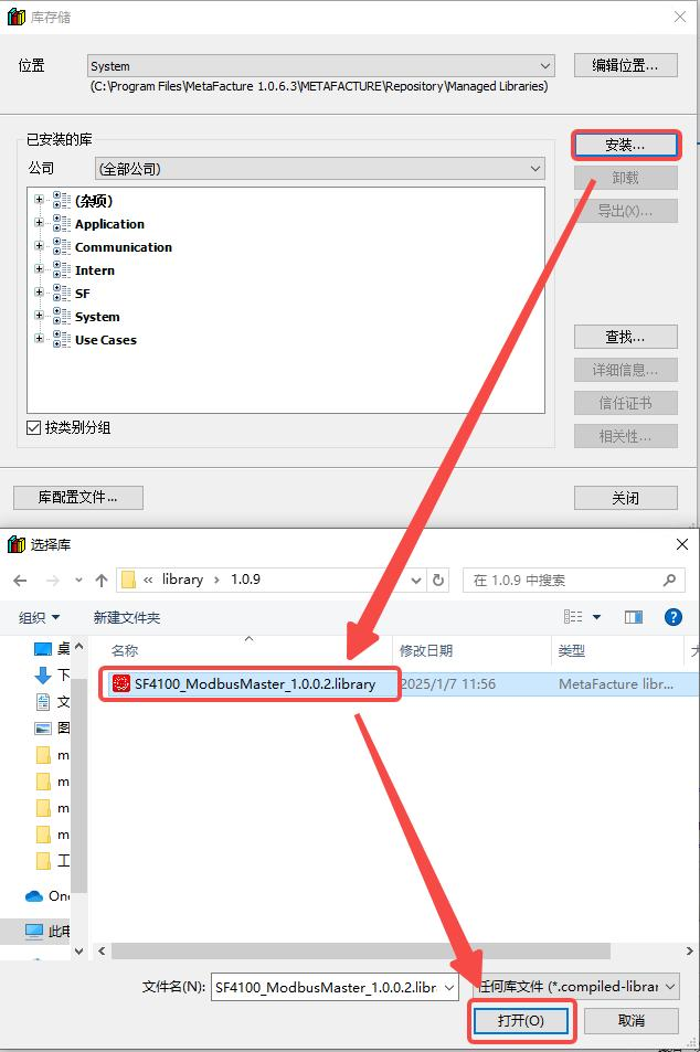 点击“安装” -- 选中新的modbus master的库文件,点击“打开”