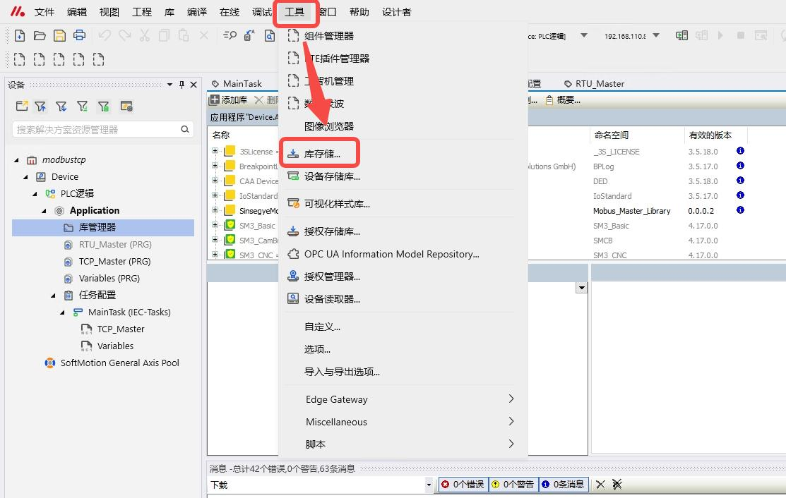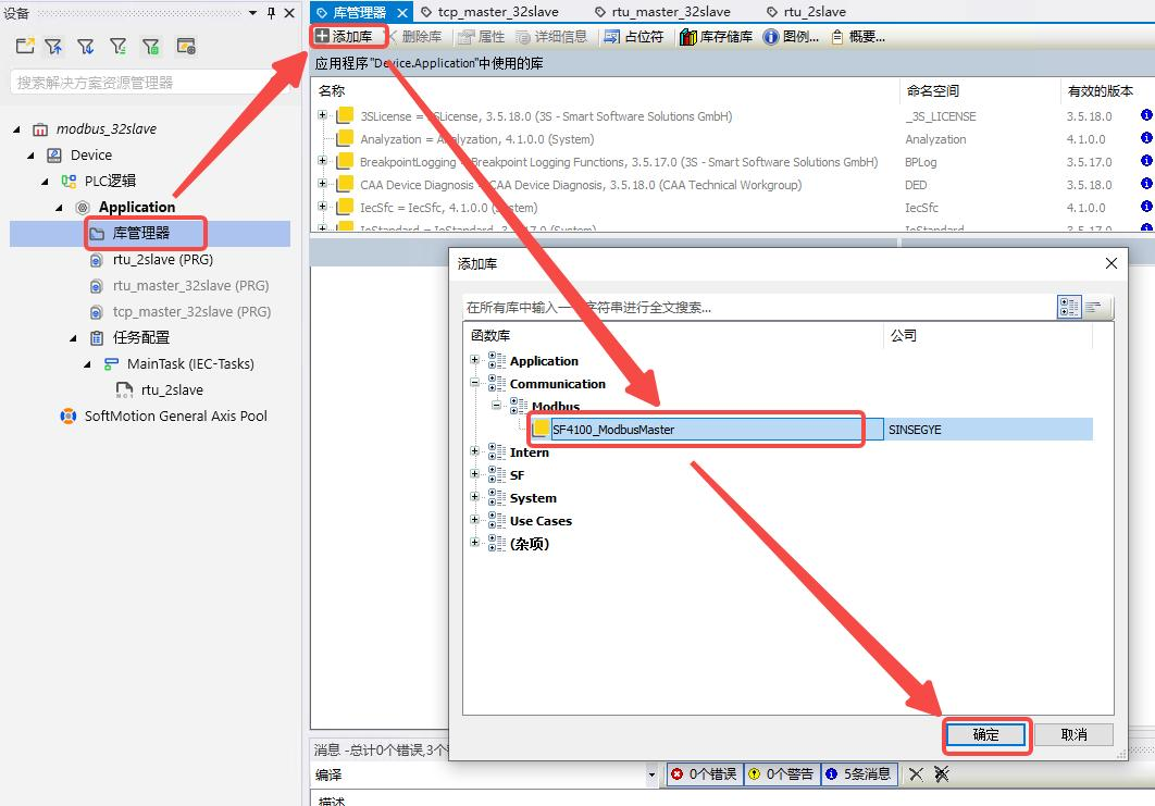 工程中点击“库管理器” -- “添加库” -- 选中新的modbus master库点击“确定”