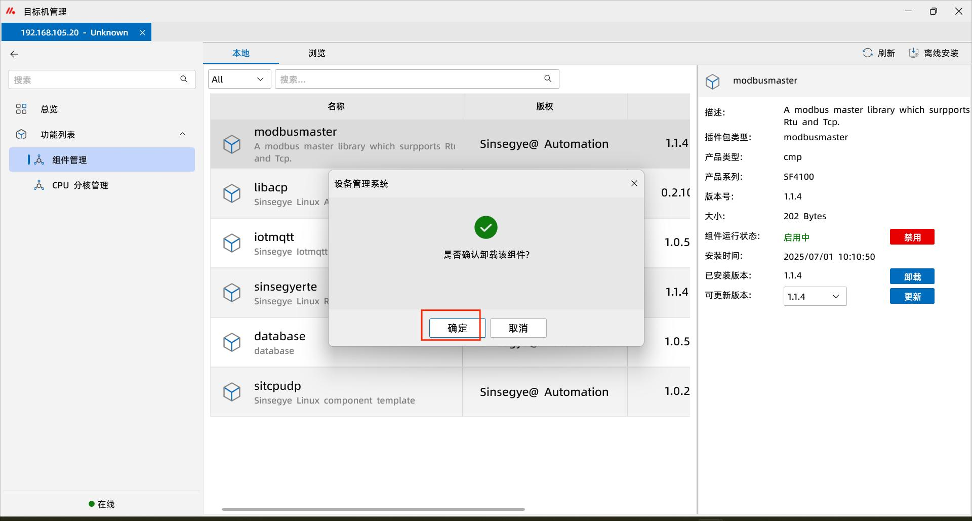 进入工智机设备管理器->“组件管理界面”->"本地”,选择组件"modbusmaster" 点击“卸载”;